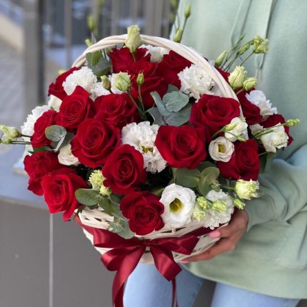Корзина Ренессанс из эустомы, трахелиума, альстромерии, роз, антирриума и агапантуса