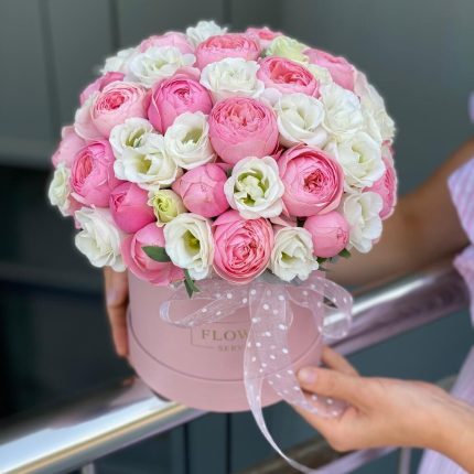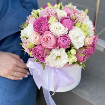 Коробка Жемчужина красоты из кустовых роз, альстромерии, эустомы и диантуса