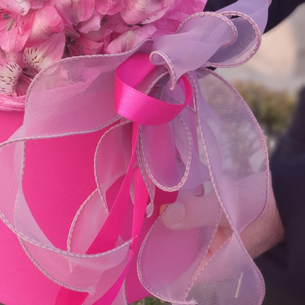Альстромерия розовая – 11 шт.Коробка шляпная – 1 шт.Лента атласная – 2 шт.Оазис флористический – 1 шт.