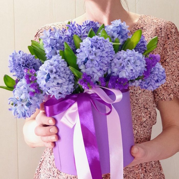 Лента атласная – 2 шт.Коробка шляпная – 1 шт.Статица фиолетовая – 3 шт.Аквапак – 1 шт.Открыточка с вашими пожеланиями – 1 шт.гиацинты – 15 шт.