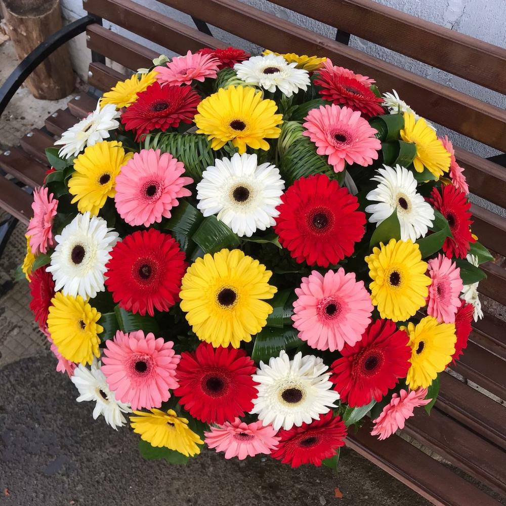 Аспидистра – 5 шт.Корзина – 1 шт.Зелень – 15 шт.Гербера – 61 шт.Фисташка – 15 шт.Берграсс пучок – 1 шт.Оазис флористический – 4 шт.