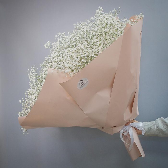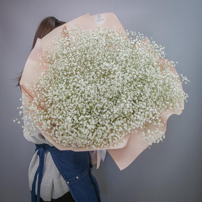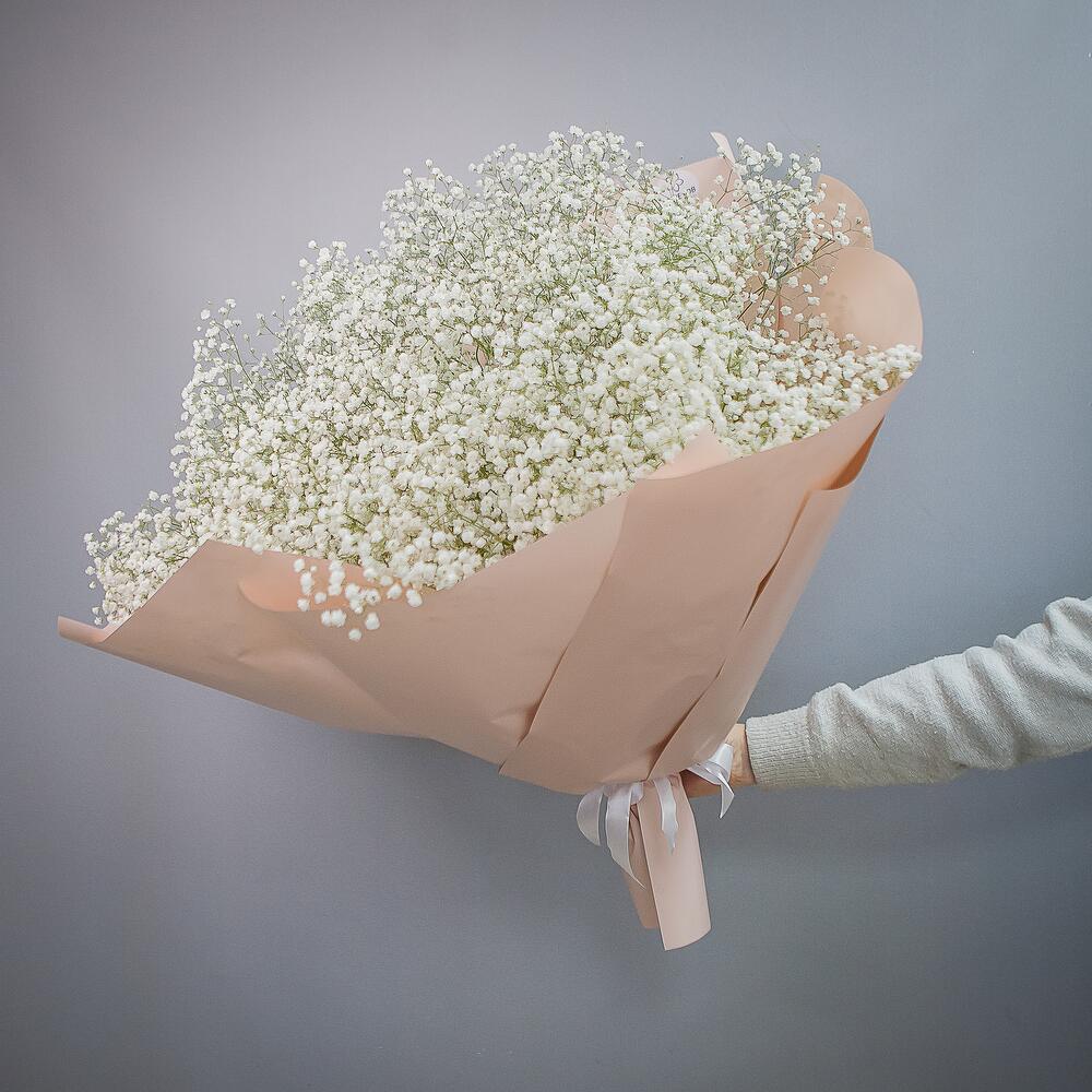 Букет цветов из 15 белых гипсофил в шляпной коробке
