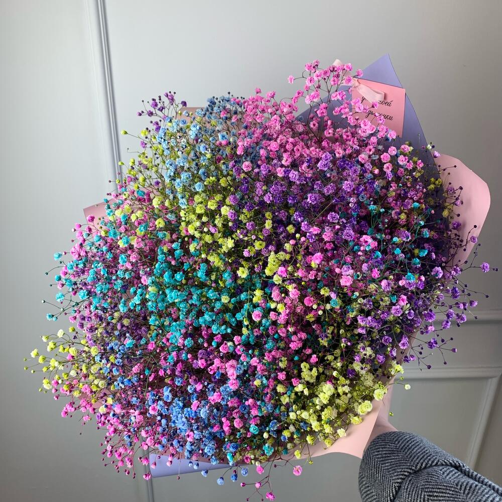 Лента атласная – 1 шт.Пленка дизайнерская – 1 шт.гипсофила радужная – 11 шт.