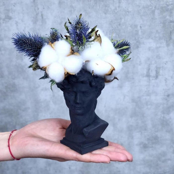 Хлопок – 5 шт.Эрингиум – 4 шт.Оазис флористический – 1 шт.голова из гипсофила – 1 шт.