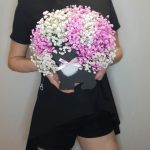 Открыточка с вашими пожеланиями – 1 шт.Оазис флористический – 1 шт.гипсофила радужная – 9 шт.любовь флориста (бесплатно) – 1 шт.кашпо котик деревянное – 1 шт.