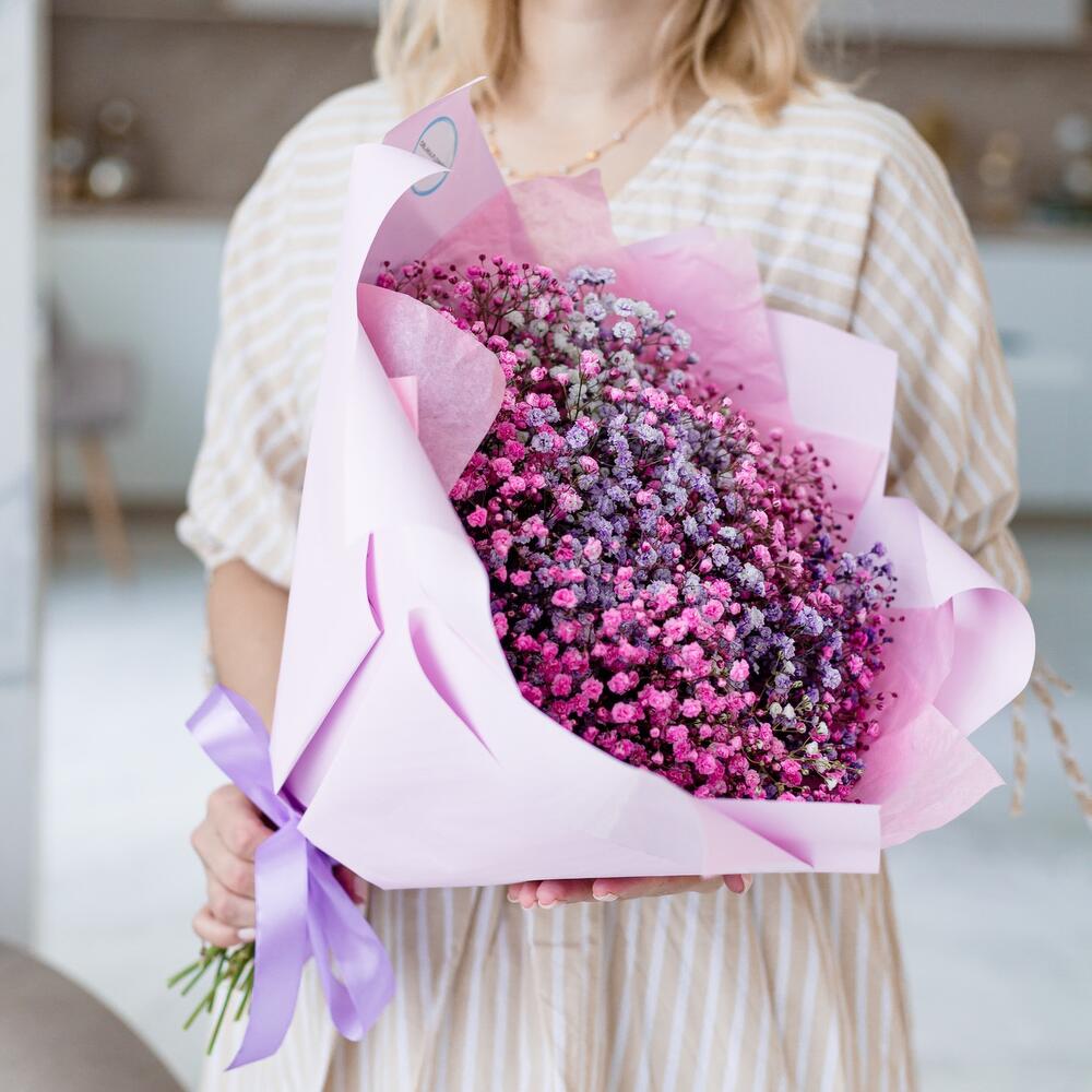 гипсофила цветная – 11 шт.Упаковка корейская пленка – 2 шт.Тишью – 2 шт.Лента атласная – 1 шт.Упаковка транспортировочная пленка – 1 шт.инструкция по уходу за цветами – 1 шт.