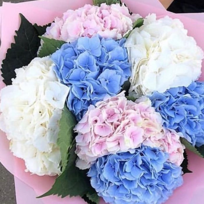 ассорти гортензий – 7 шт.Упаковка дизайнерская – 1 шт.Лента атласная – 2 шт.хорошее настроение – 100 шт.Открытка – 1 шт.инструкция по уходу за цветами – 1 шт.коробка переноска – 1 шт.Кризал – 1 шт.