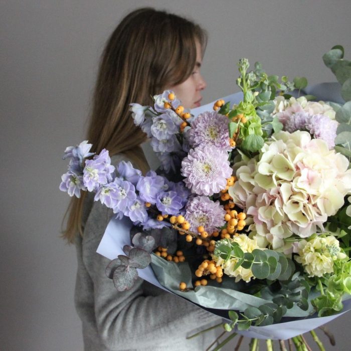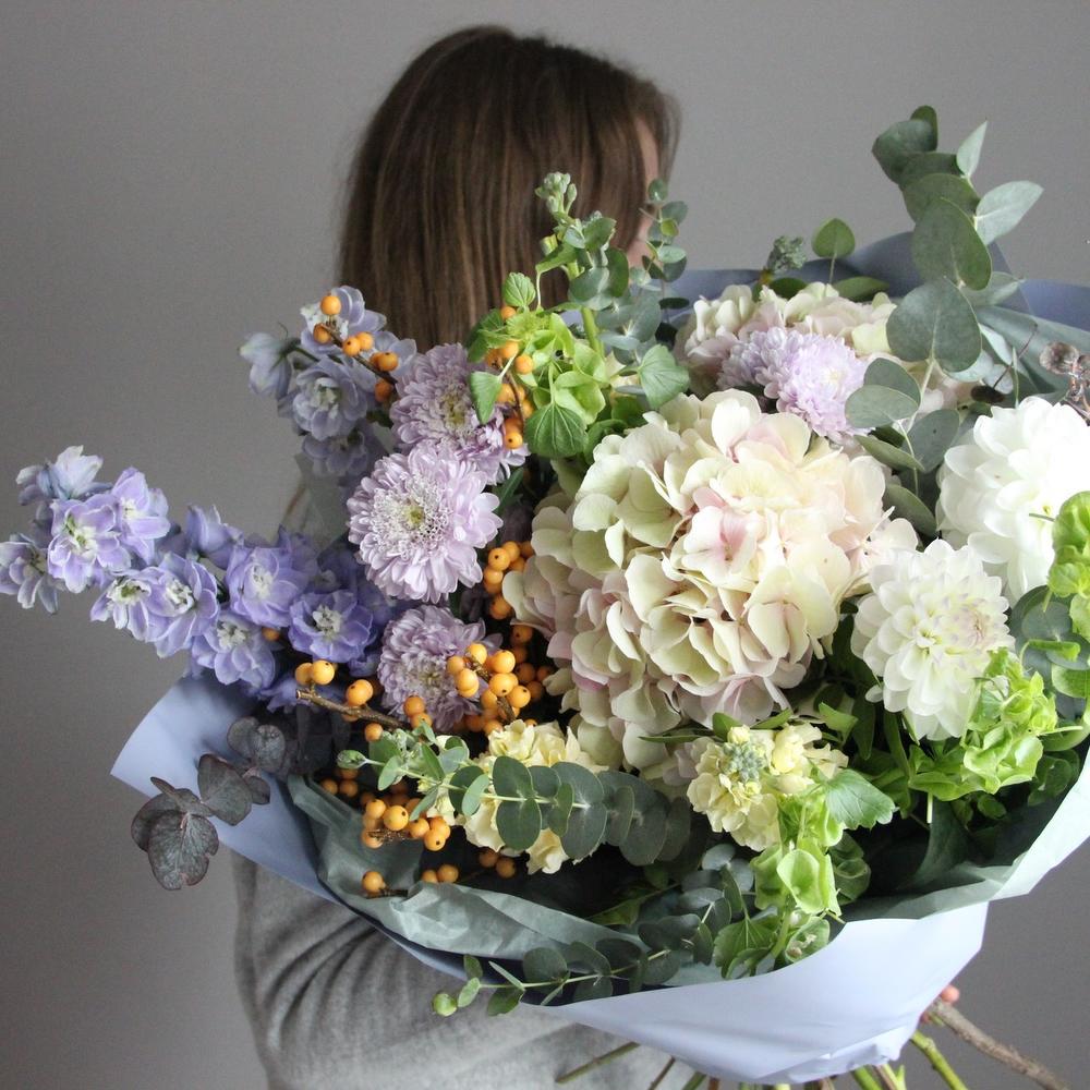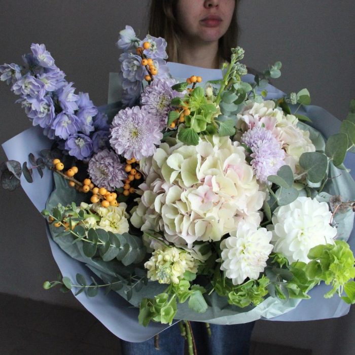 Дельфиниум – 2 шт.Гортензия – 2 шт.Илекс – 2 шт.Астра – 3 шт.Маттиола – 3 шт.Георгина – 3 шт.ирландский колокольчик – 3 шт.Эвкалипт – 5 шт.Тишью – 2 шт.Упаковка – 2 шт.Лента атласная – 1 шт.