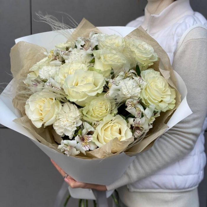 Нежный букет из белой розы с декоративной стифой