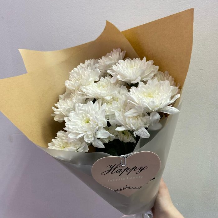 Хризантема кустовая – 3 шт.Упаковка крафт – 1 шт.Открыточка с вашими пожеланиями – 1 шт.Лента атласная – 1 шт.