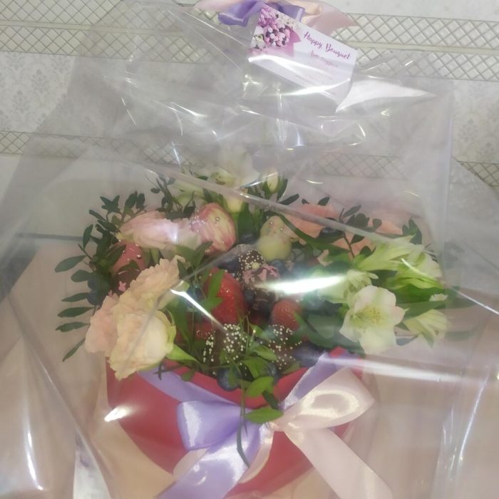 Альстромерия – 2 шт.Клубника – 25 шт.Роза кустовая розовая – 3 шт.Коробка сердце – 1 шт.Фисташка пучок – 1 шт.Клубника в шоколаде – 13 шт.