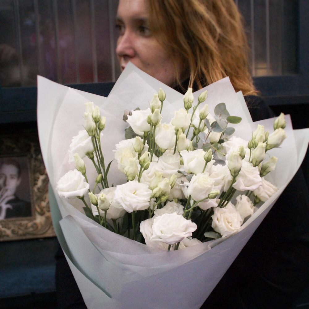 Эвкалипт – 3 шт.Эустома – 13 шт.Тишью – 2 шт.Атласная лента – 2 шт.Матовая пленка – 2 шт.
