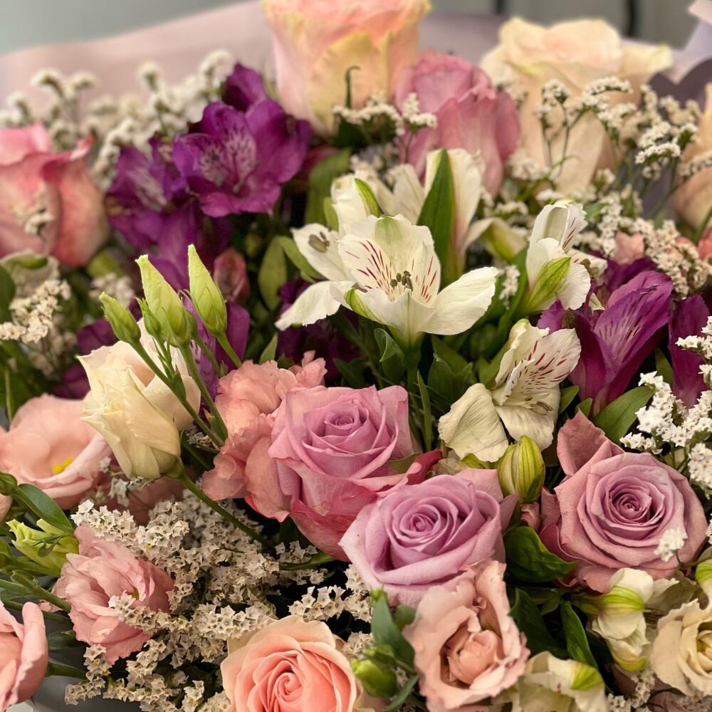 Роза – 9 шт.Альстромерия – 7 шт.эустома ветка – 7 шт.лиминиум – 5 шт.Стильная упаковка – 5 шт.Атласная лента – 1 шт.работа флориста – 1 шт.