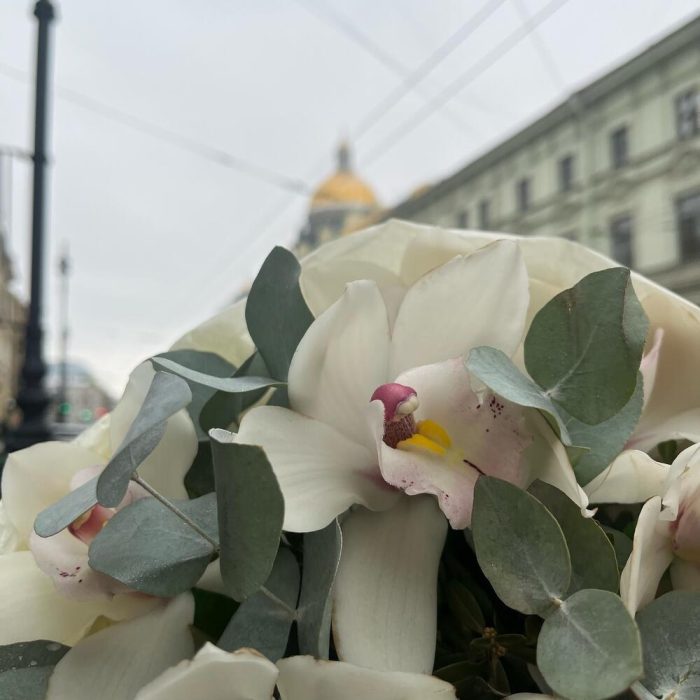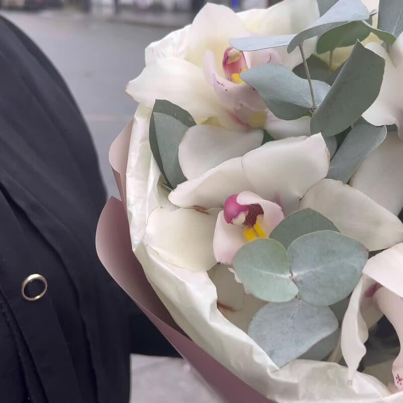 Эвкалипт – 4 шт.Лента атласная – 1 шт.Тишью – 1 шт.удлинитель для орхидеи – 7 шт.Упаковка корейская пленка – 1 шт.премиум орхидея цимбидиум – 7 шт.