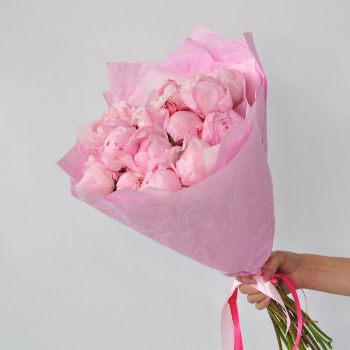 Лента атласная – 1 шт.Упаковка дизайнерская – 2 шт.Пион розовый – 15 шт.