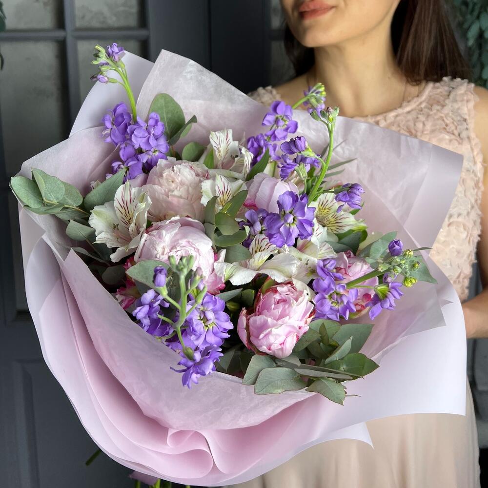 Альстромерия – 5 шт.Маттиола – 5 шт.Эвкалипт – 7 шт.Лента атласная – 1 шт.Пион Сара Бернар – 5 шт.Упаковка дизайнерская – 2 шт.