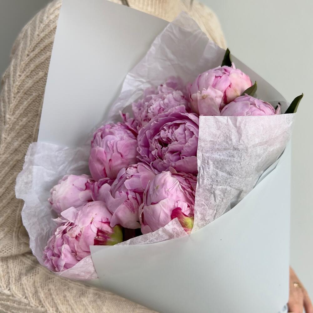 Пион – 9 шт.Тишью белое – 2 шт.Пленка дизайнерская – 2 шт.