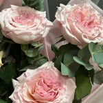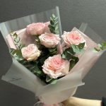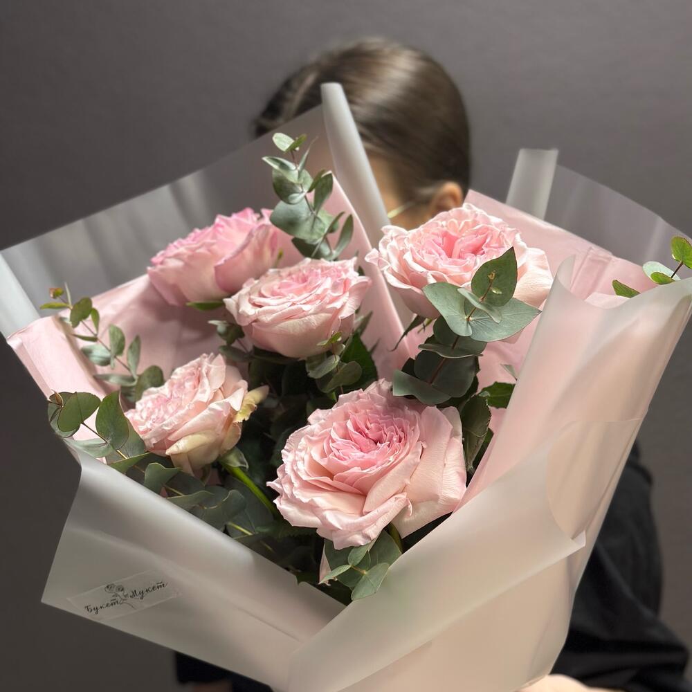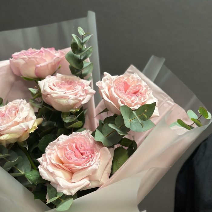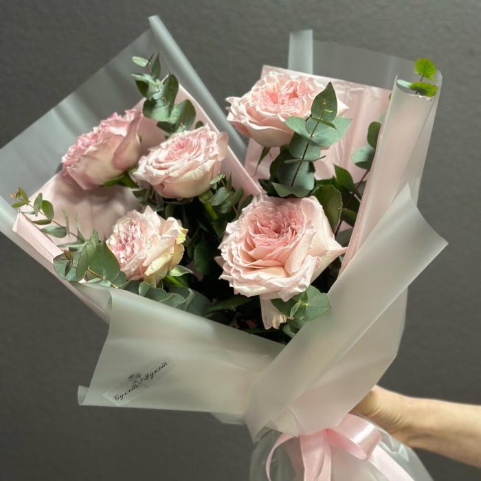 Эвкалипт – 2 шт.Лента атласная – 1 шт.Тишью – 2 шт.Пленка дизайнерская – 2 шт.роза пинк охара(ароматная) – 5 шт.