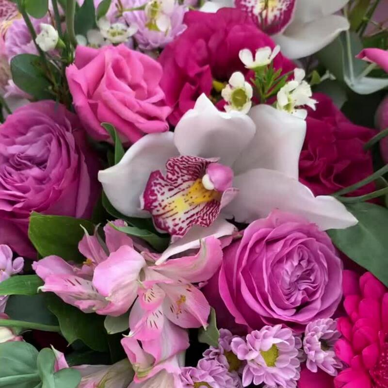 Хризантема Сантини – 4 шт.Альстромерия – 2 шт.Орхидея Цимбидиум – 5 шт.Гербера – 3 шт.Роза пионовидная – 5 шт.Лизиантус – 3 шт.Ваксфлауэр – 2 шт.Эвкалипт – 1 шт.Рускус – 25 шт.Упаковка дизайнерская – 2 шт.Лента атласная – 1 шт.