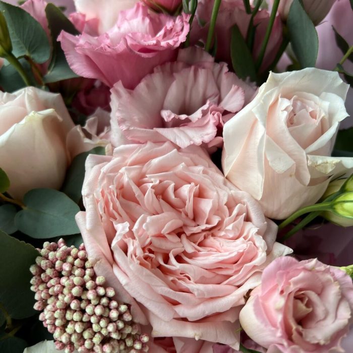 Садовая роза – 9 шт.Лизиантус – 3 шт.Маттиола – 2 шт.Гиперикум – 1 шт.Озотамнус – 1 шт.Эвкалипт – 2 шт.декоративная упаковка – 1 шт.Атласная лента – 1 шт.