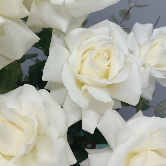французские розы – 5 шт. Эвкалипт – 2 шт. открытка с вашими пожеланиями – 1 шт.