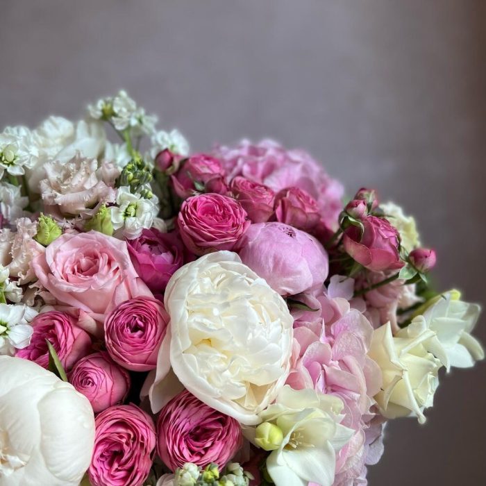 Гортензия – 2 шт.Пионовидная кустовая роза – 3 шт.Лизиантус (эустома) – 2 шт.Пион – 5 шт.Пионовидная одноголовая роза – 3 шт.Одноголовая роза – 3 шт.Фрезия – 3 шт.Маттиола – 6 шт.Кустовая роза – 2 шт.Атласная лента – 2 шт.