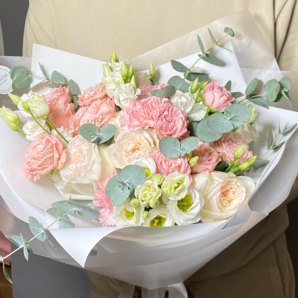 Эвкалипт – 5 шт.Лента атласная – 1 шт.Диантус белый – 2 шт.Диантус розовый – 3 шт.Матовая пленка – 2 шт.Корейская упаковка – 2 шт.лизиантус росита вайт – 3 шт.роза white o’hara – 3 шт.кустовая роза madame bombastic – 2 шт.