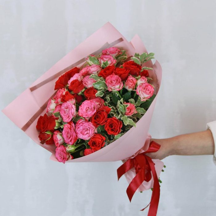 роза кустовая кения 40 см – 11 шт.Питтоспорум – 1 шт.Пленка – 2 шт.Лента – 1 шт.