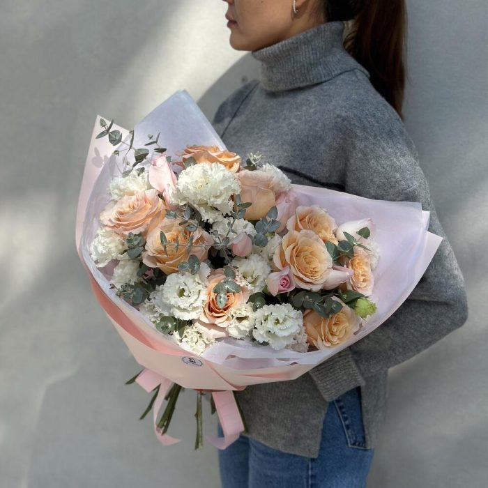 Гвоздики, Кустовые розы, Лизиантусы, Пионовидные розы, Розы