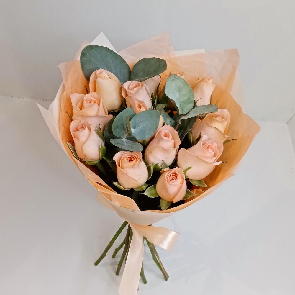 Букет из 13 роз персиковых с эвкалиптом