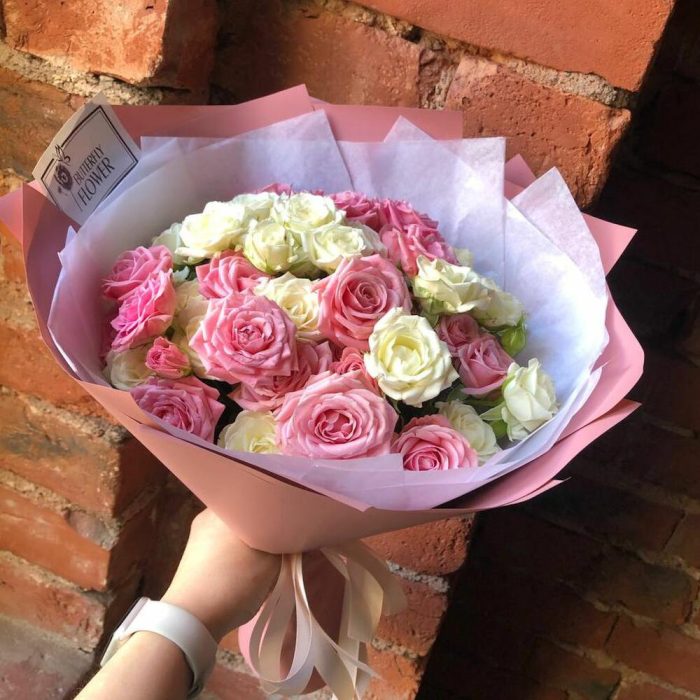 Букет из 15 белых и розовых кустовых роз “Розовый туман”