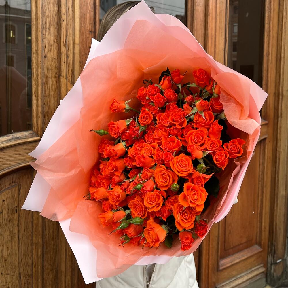 роза оранжевая кустовая 60 см – 25 шт.Дизайнерская упаковка – 5 шт.Тишью – 2 шт.Лента атласная – 2 шт.