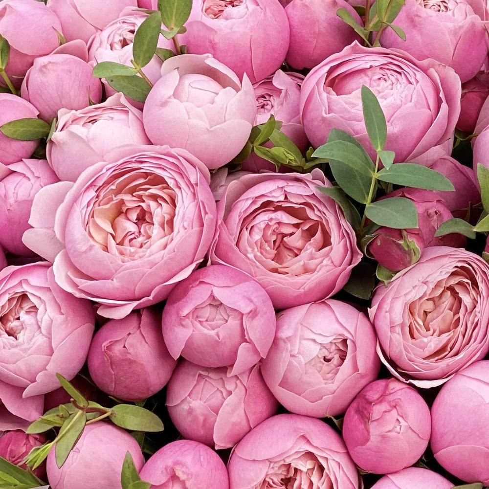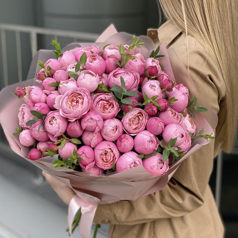 кустовая пионовидная роза сильвия пинк – 15 шт. Эвкалипт – 3 шт. Оформление – 1 шт.