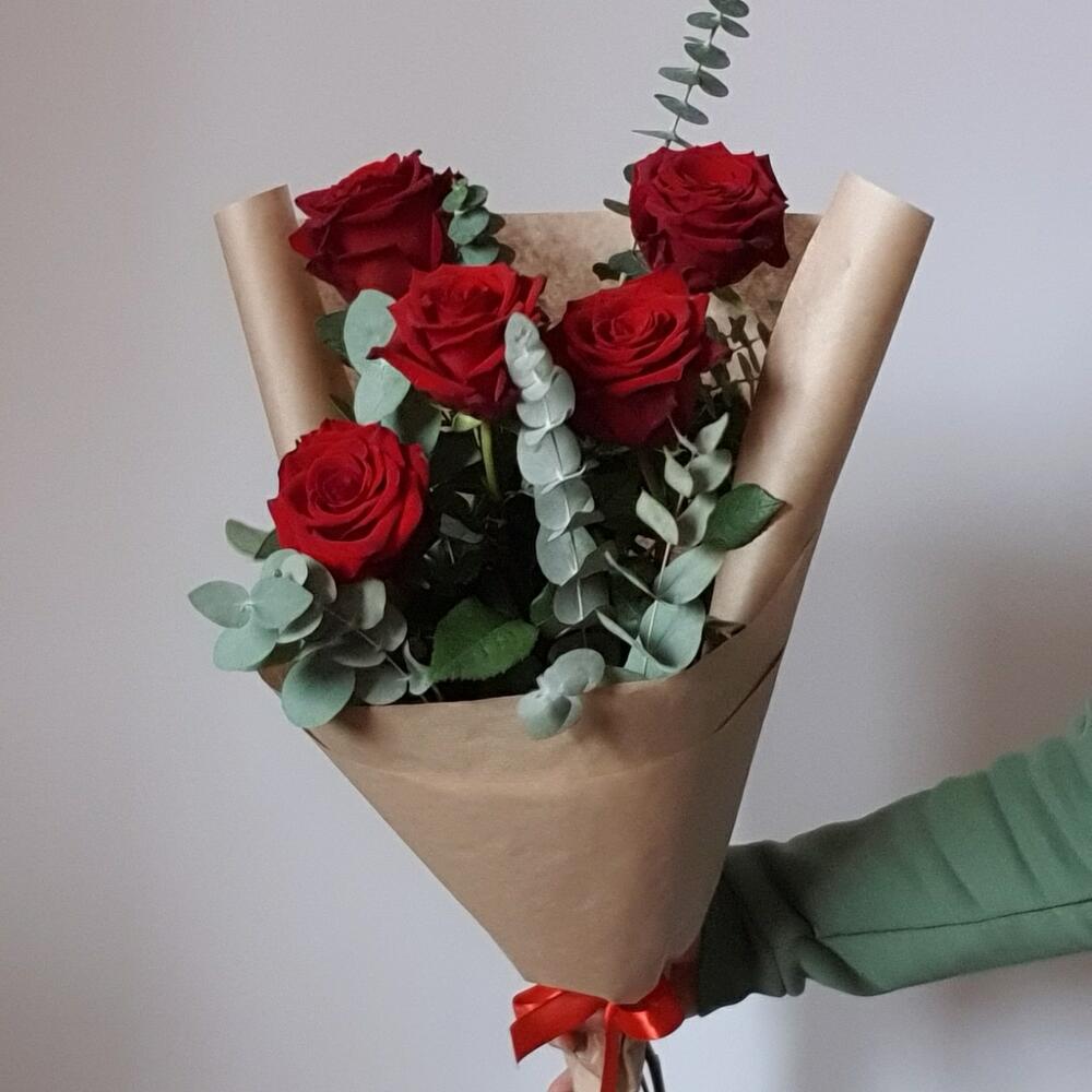 Эвкалипт – 5 шт.Упаковка – 2 шт.Лента атласная – 1 шт.Роза Эксплорер – 5 шт.