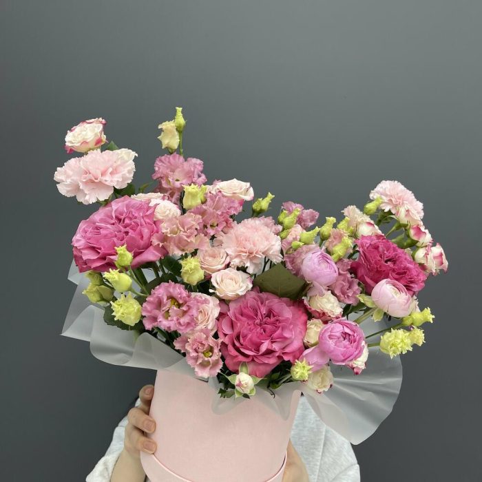 Корзина с пионовидными розами,ранункулюсами,эустомой и фисташкой