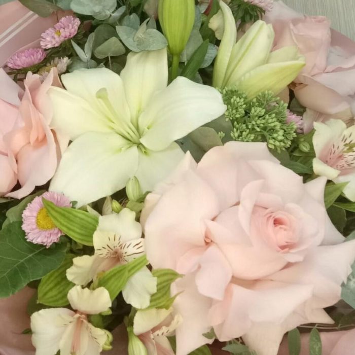 Категории: Альстромерии, Лилии, Розы, Эвкалипт