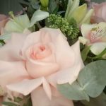 Роза розовая – 3 шт. Лилия белая – 1 шт. Альстромерия Микс Европа – 3 шт. Эвкалипт Baby Blue – 3 шт.
