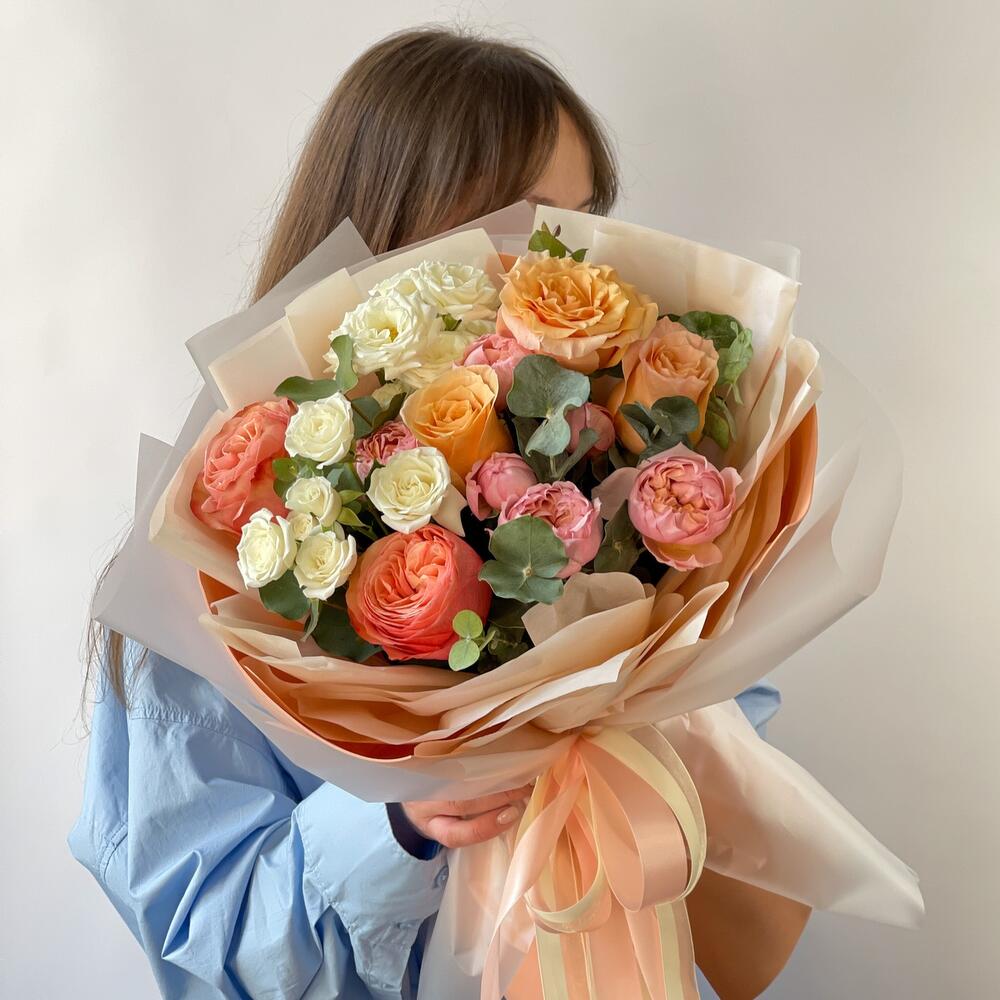 Лента – 1 шт.Роза кустовая – 2 шт.Эвкалипт – 1 шт.Роза одноголовая – 5 шт.Упаковка – 2 шт.Роза Джульетта – 1 шт.