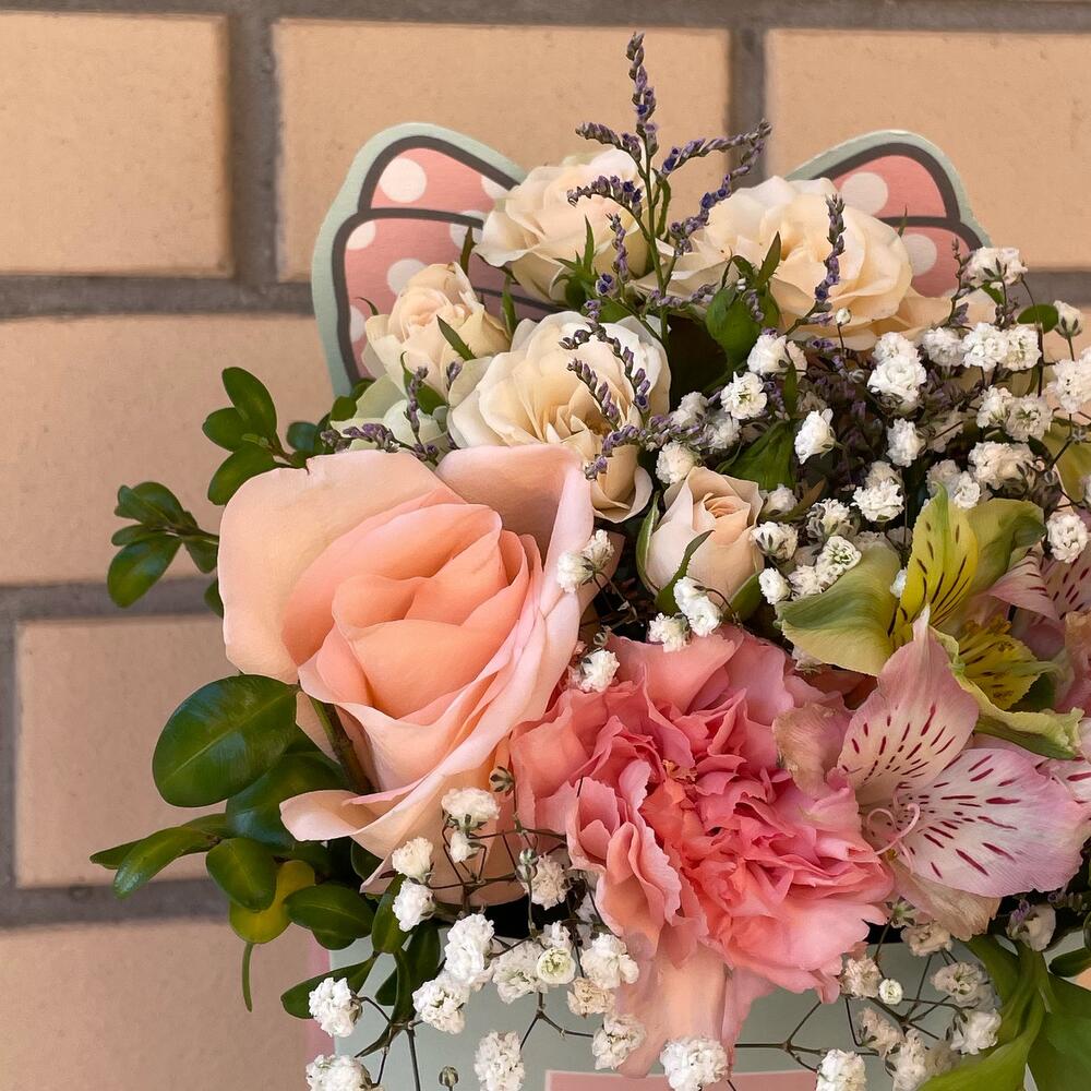 Альстромерия – 2 шт.Роза – 2 шт.Роза кустовая – 1 шт.Гипсофила – 3 шт.Лимониум – 1 шт.Губка флористическая – 1 шт.коробка для цветов – 1 шт.