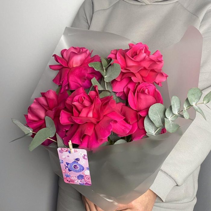 Эвкалипт – 2 шт.Пионовидная роза – 5 шт.Упаковка дизайнерская – 1 шт.Открыточка с вашими пожеланиями – 1 шт.