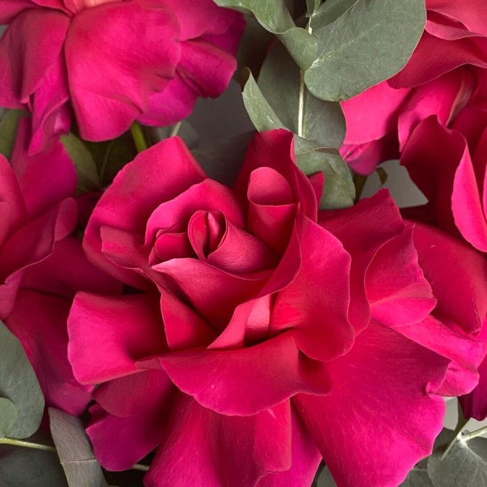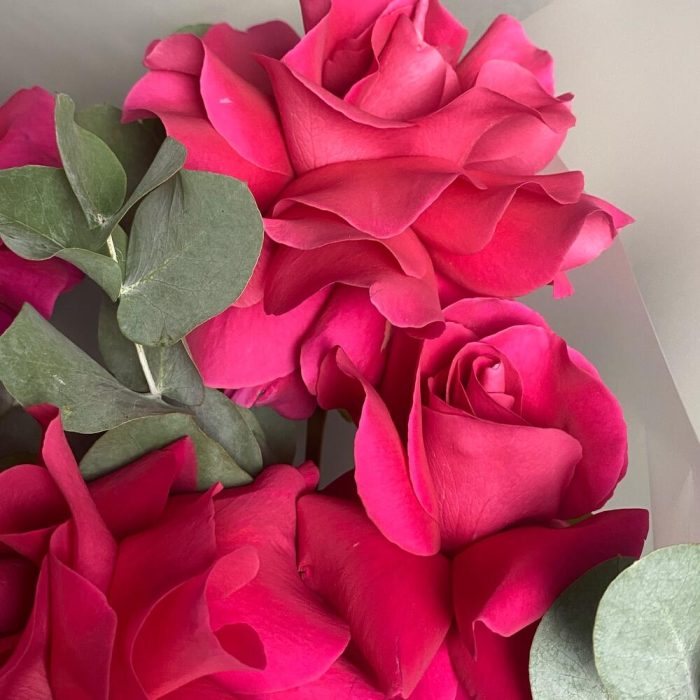 Яркие французские пионовидные розы. Прекрасный танец ароматных роз и эвкалипта для самых искушённых.
