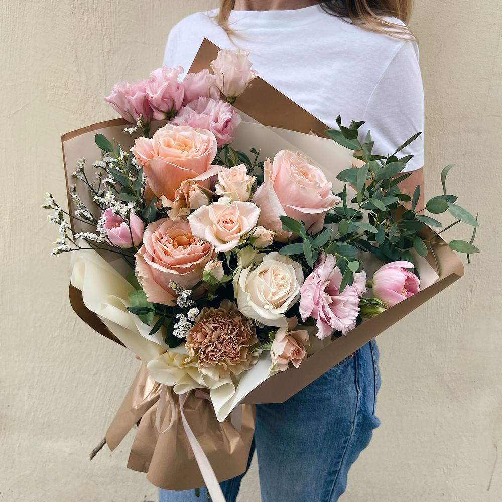 Лимониум – 1 шт.Роза кустовая – 1 шт.Тюльпан – 2 шт.Эвкалипт – 1 шт.Роза Эквадор – 4 шт.Диантус – 1 шт.Фисташка – 2 шт.Лизиантус алиса – 1 шт.