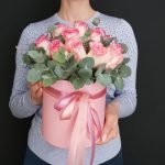 Роза – 19 шт.Эвкалипт – 2 шт.Оазис флористический – 2 шт.Коробка шляпная – 1 шт.