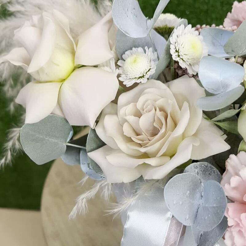 Роза кустовая – 2 шт.Эвкалипт – 6 шт.Ромашка – 1 шт.Эустома – 2 шт.Диантус – 2 шт.Коробка шляпная – 1 шт.Сухоцветы – 2 шт.Роза Мента – 3 шт.Губка флористическая – 1 шт.