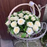 Роза белая – 25 шт.Рускус – 10 шт.Корзина – 1 шт.Оазис флористический – 1 шт.