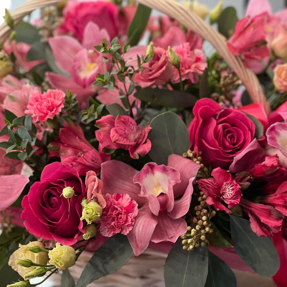 Корзина с цветами в ярко розовом цвете
