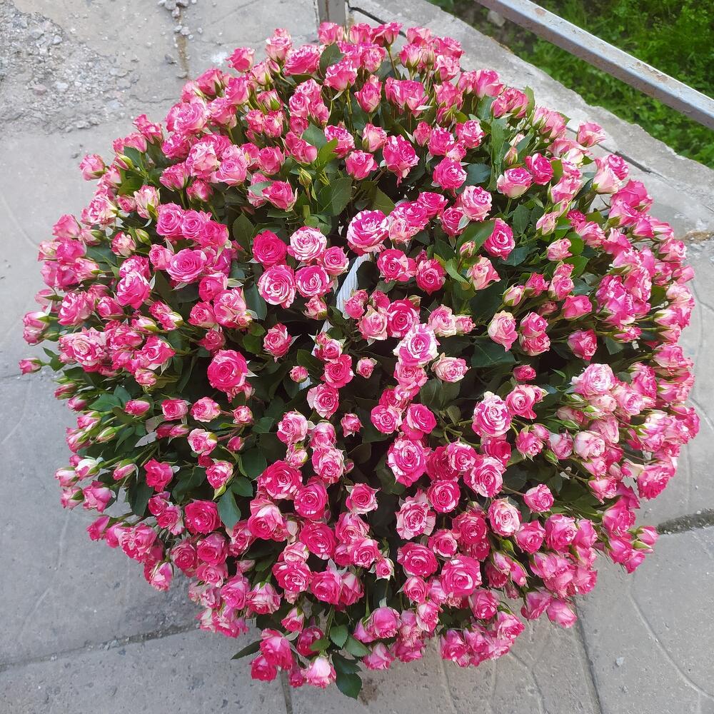 Роза кустовая – 101 шт.Корзина плетеная – 1 шт.Оазис флористический – 3 шт.
