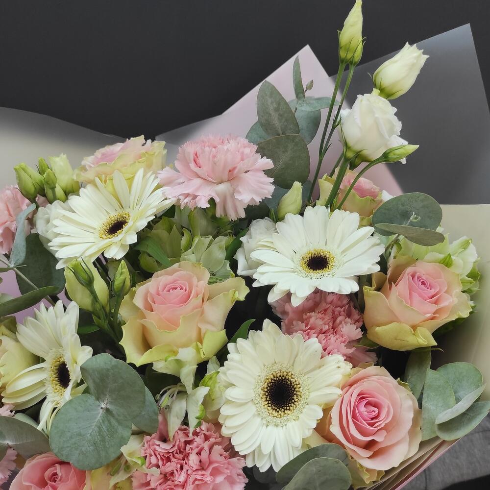 Гербера – 5 шт.Роза – 7 шт.Лизиантус – 3 шт.Диантус – 5 шт.Эвкалипт – 2 шт.Упаковка дизайнерская – 1 шт.
