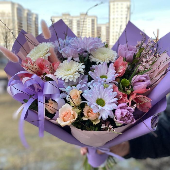 Альстромерия – 3 шт.Роза кустовая – 1 шт.Хризантема кустовая – 2 шт.Гербера мини – 3 шт.Тюльпан пионовидный – 3 шт.Упаковка дизайнерская – 1 шт.