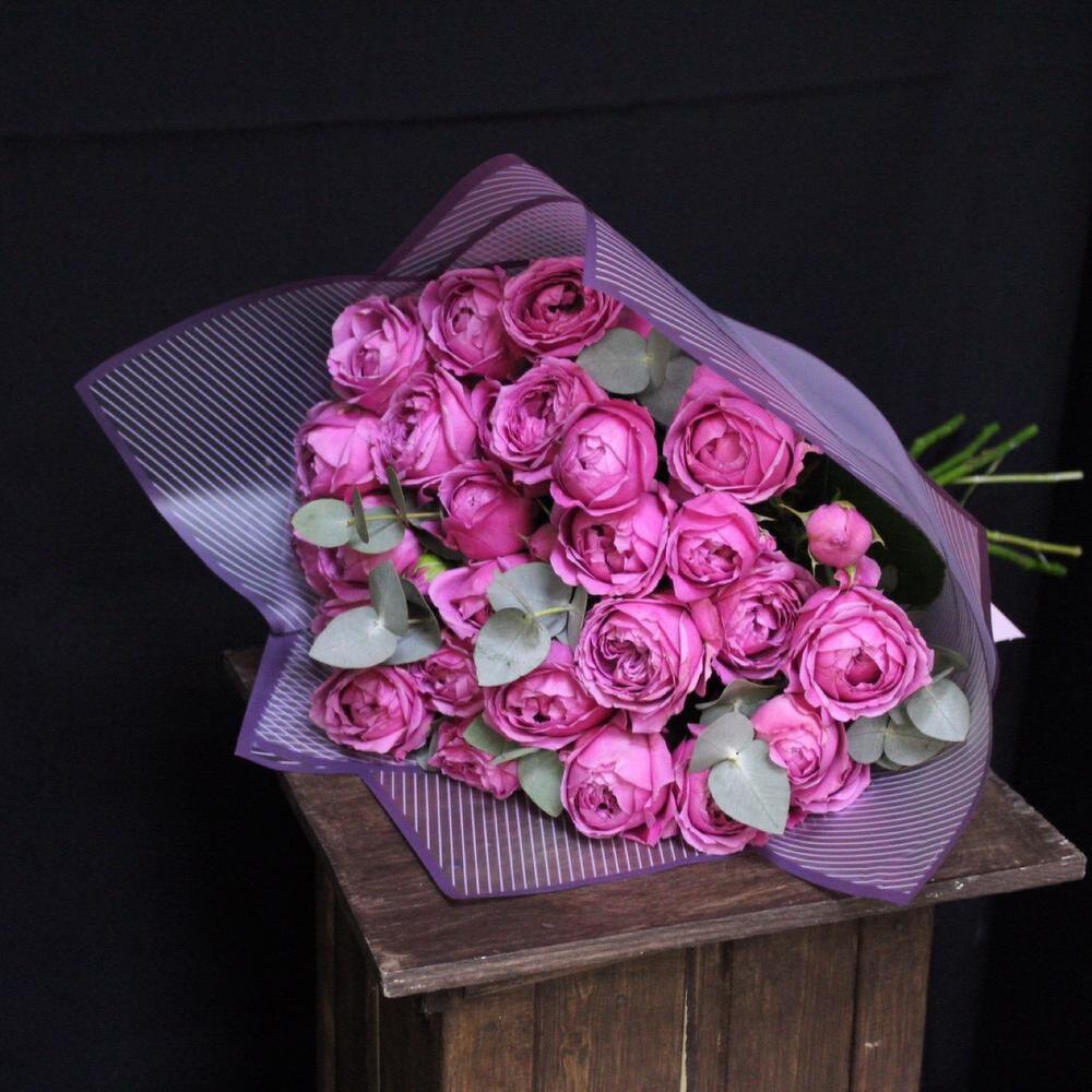 Букет из кустовой розовой пионовидной розы и эвкалипт